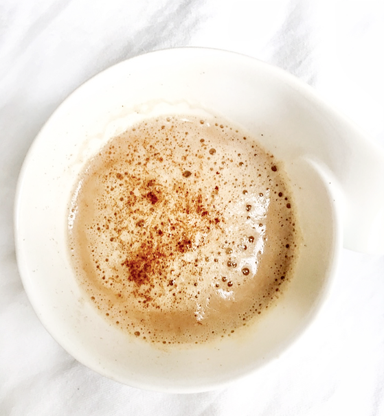 3. Strain the tea mix into two mugs and you will have a dark coloured, strong smelling liquid. Add the cashew milk equally and finally drizzle in the maple syrup to taste and perhaps a sprinkling of cinnamon on the top... et voila.
