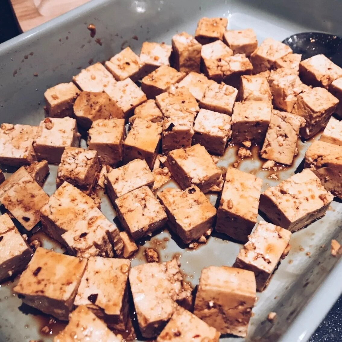 - Chop the tofu into 2cm cubes with a sharp knife, put in a bowl and marinade with all the goods - soy sauce, garlic, ginger, maple syrup, lime, chilli flakes, s + p. If you have the time, leave the marinade coated on for around 30 minutes or more.