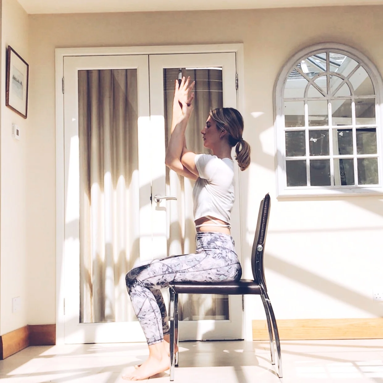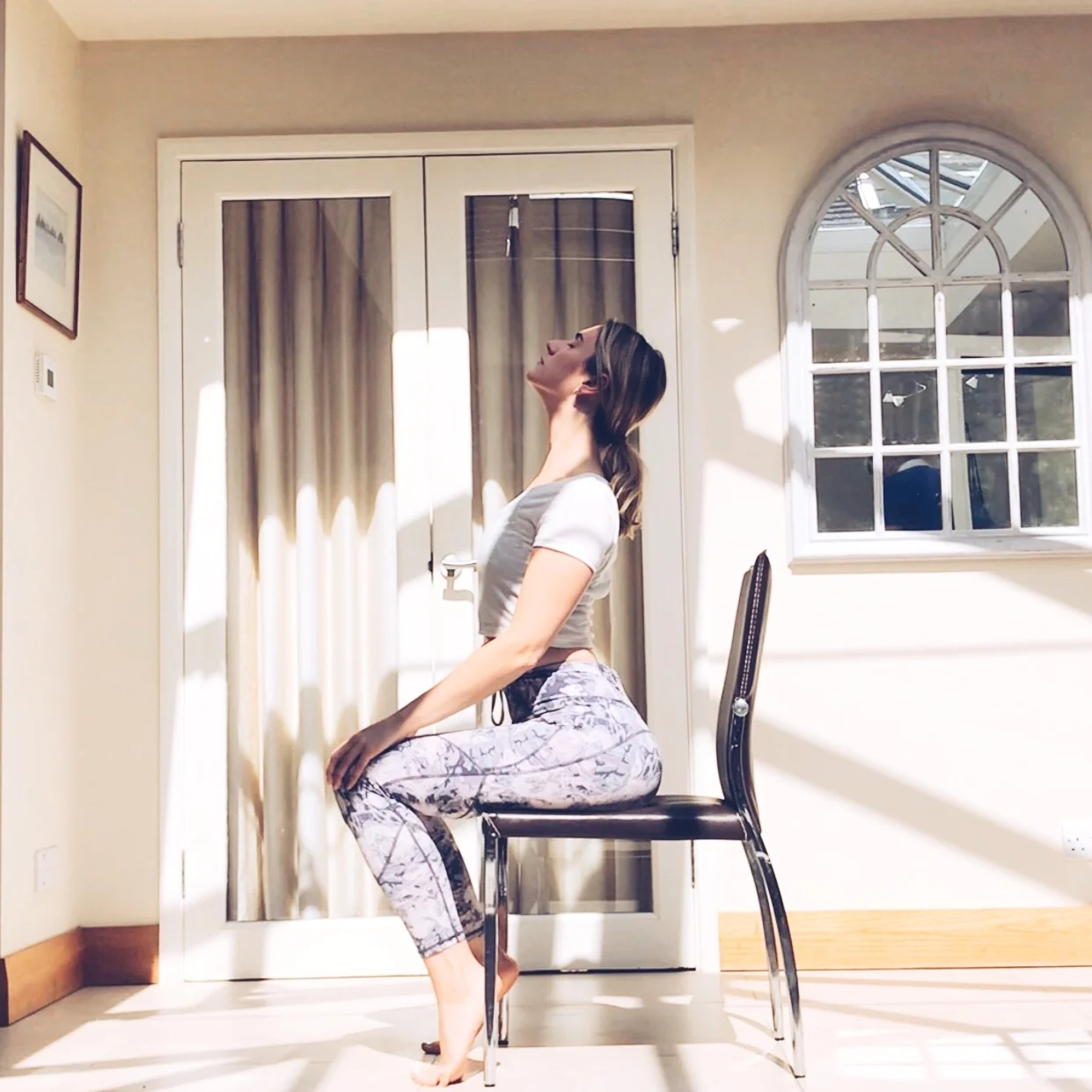 Take one hand behind you to the top of the chair and the other to the arm rest or the side of the seat. Lift up as tall as you can, take a breath in and twist as you breathe out. Hold it for at least 30 seconds, keeping long through your spine. Release and repeat on the other side.